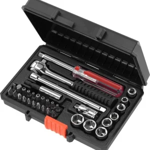 Accessory set ideal for all applications around the car. With screws, sockets and small reversible ratchet for screwing work in difficult places. Features Small reversible